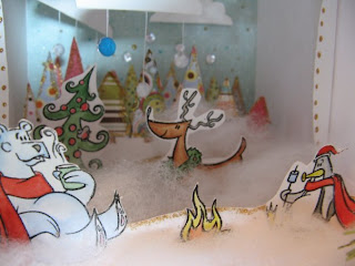 Теперь о хорошем. У одной моей знакомой 24 декабря Денрик!!!! Я очень хотела ее порадовать чем-то необычным, т.к. в скрапе она уже девушка искушенная, я подумала что открыткой ее не удивишь. Лазала-лазала в поисках вдохновлялок и так навдохновлялась что решила сделать диораму. Выполнила ее из бумажки для акварели, обрезков дизайнерской бумаги для скрапа, объемного контура с блестками. Картинки распечатывала на принтере (их тоже нарыла на каком-то сайте, уже не помню на каком) и раскрашивала Ленинградскими красочками. Снег - это рваный вручную синтепон. Вроде все. Зацените: